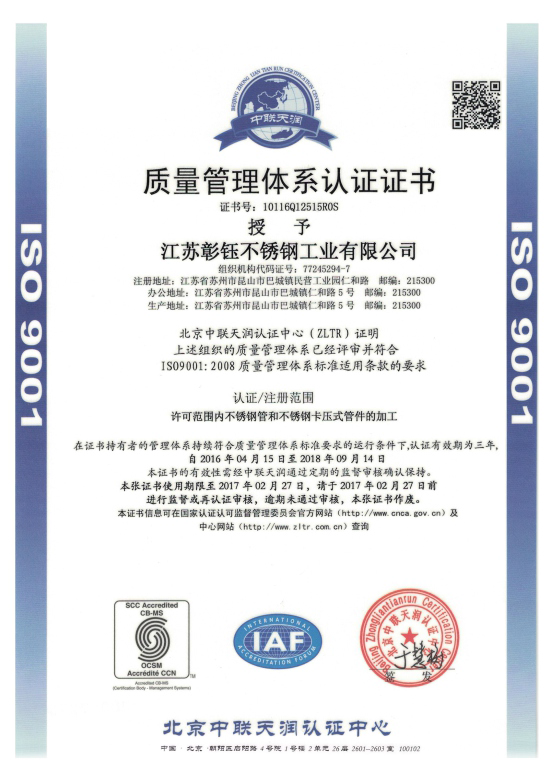 江蘇彰鈺不銹鋼工業(yè)有限公司是生產(chǎn)不銹鋼焊管、管件及其制品的專業(yè)企業(yè),公司坐落于江蘇省昆山市生態(tài)景觀的陽澄湖旁,交通便捷。   公司擁有國內(nèi)先進、配套齊全的高精密不銹鋼焊管生產(chǎn)線及卡壓式管件生產(chǎn)設備,并擁有萬能力學試驗、渦流探傷、水壓試驗、金相分析等先進完善的檢測設備,可提供不銹鋼焊管、內(nèi)整平管及不銹鋼卡壓式、溝槽式、焊接式管件,各項性能均符合GB、JlS、ASTM等國家及國際規(guī)格標準,并廣泛用于汽車、自行車、醫(yī)療器械、自來水、流體輸送等行業(yè)。